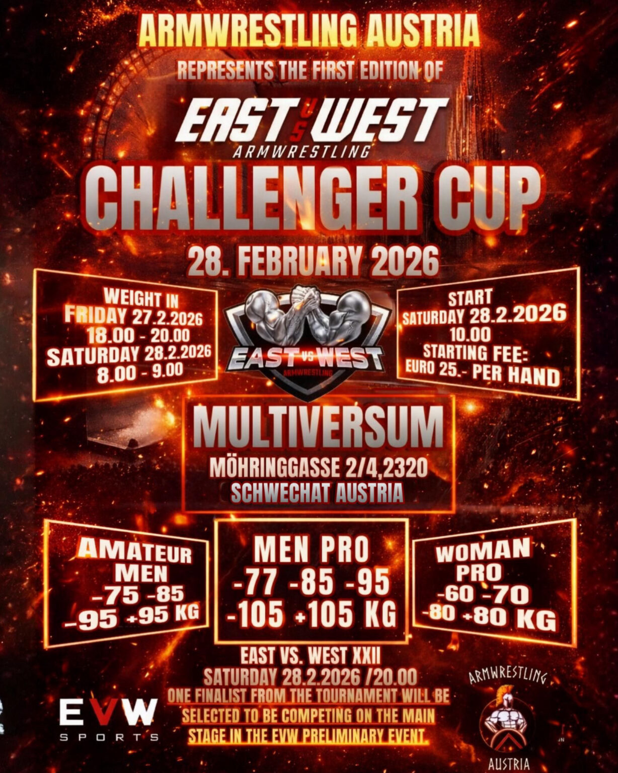 Am Samstag, 28. Februar 2026 findet erstmals ein Armwrestling-Event "East vs. West XXII" in der Eventhalle des Multiversums Schwechat statt!